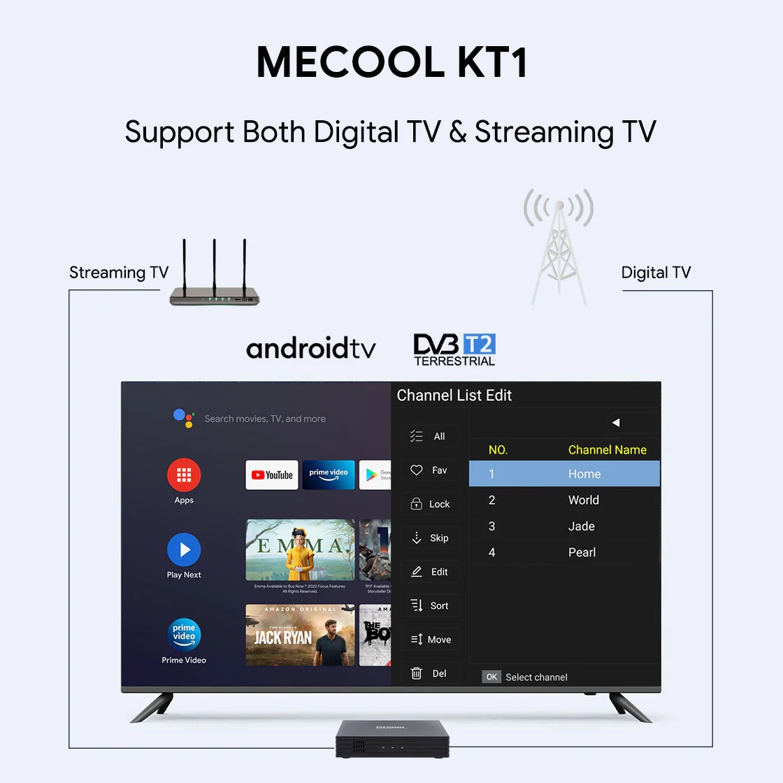 Upgrade your TV with the Android TV BOX Mecool KT1. This device runs on Android TV 10 and features a DVB-T/T2/C tuner, dual-band WiFi, Bluetooth, and impressive image processing capabilities. Transform your TV into a smart media player and enjoy endless entertainment options with this Google-certified Android TV box.