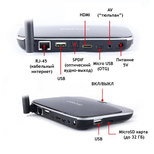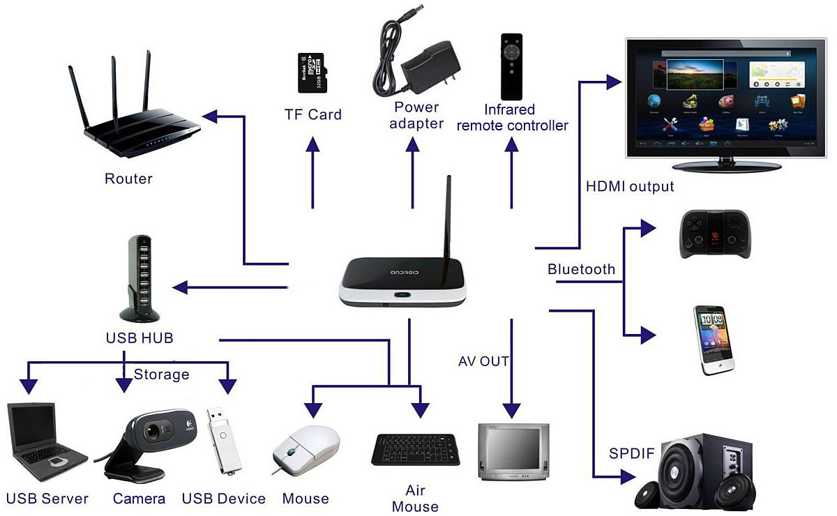 Media Player z systemem Android 4.2 z obsługą FullHD 1080p, wbudowanym WiFi 802.11b/g/n, wyjścia HDMI i AV, wyjście SPDIF, dwóch portów USB, port microUSB dla podłączenia do komputera, porty Ethernet i microSD.
