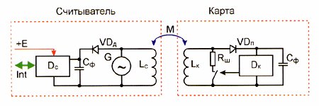 Czytnik zawiera wysokiej częstotliwości generator G, która pobudza czytnik anteny Lc. Ze względu na obecność elektromagnetycznego sprzęgła pomiędzy anteną M oraz czytnikiem anteny identyfikatora (karta) LK w końcu napięcie indukowane, które zależy od wersji i odległości pomiędzy kartą i czytnikiem.Napięcie indukowane jest używane do zasilania kart chipowych przez DK prostownik utworzony przez diody i kondensator filtra VDP Cf. Kart IC DK moduli napięcia w antenie przez IK Rm rezystor manewrowy.