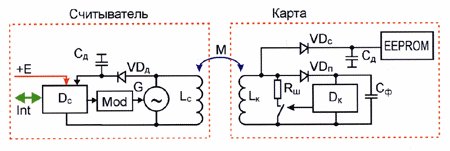 Ze względu na komunikację anteny modulacji pojawia się w antenę czytnika Lc, jest wykrywany przez VDD diody i wchodzi do układu czytnika Dc, który deszyfruje kod karty i jej BL do kontrolera za pośrednictwem Int. interfejs.Zgodnie z tą zasadą pracowalił tak pierwsze pasywne R / O (Read Only - tylko do odczytu) Bliskość-czytniki kart i.Następnie powstały identyfikatory, który może nie tylko przekazywać informacje czytnika, ale i programować (zapis danych do pamięci). W zakresie podstawowych zasad RFID czytnikie pojawił się modulator, który modulował czytnik przewoźnika,w karcie - detektor i przeprogramowany I zapisanyj, który rejestruje informacje przekazane przez czytnik (Fot. 2).Identyfikatory (mapy) przy takiej technologii już nazwie R / W (Read Write), To znaczy- "czytanie i zapuis."