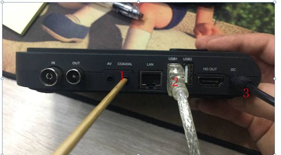 - Użyć małego drążka lub wykałaczkę, żebym wcisnąć przycisk RESET, który jest w środku gniazdka COAXIAL, dalej trzymać, nie usuwając.
